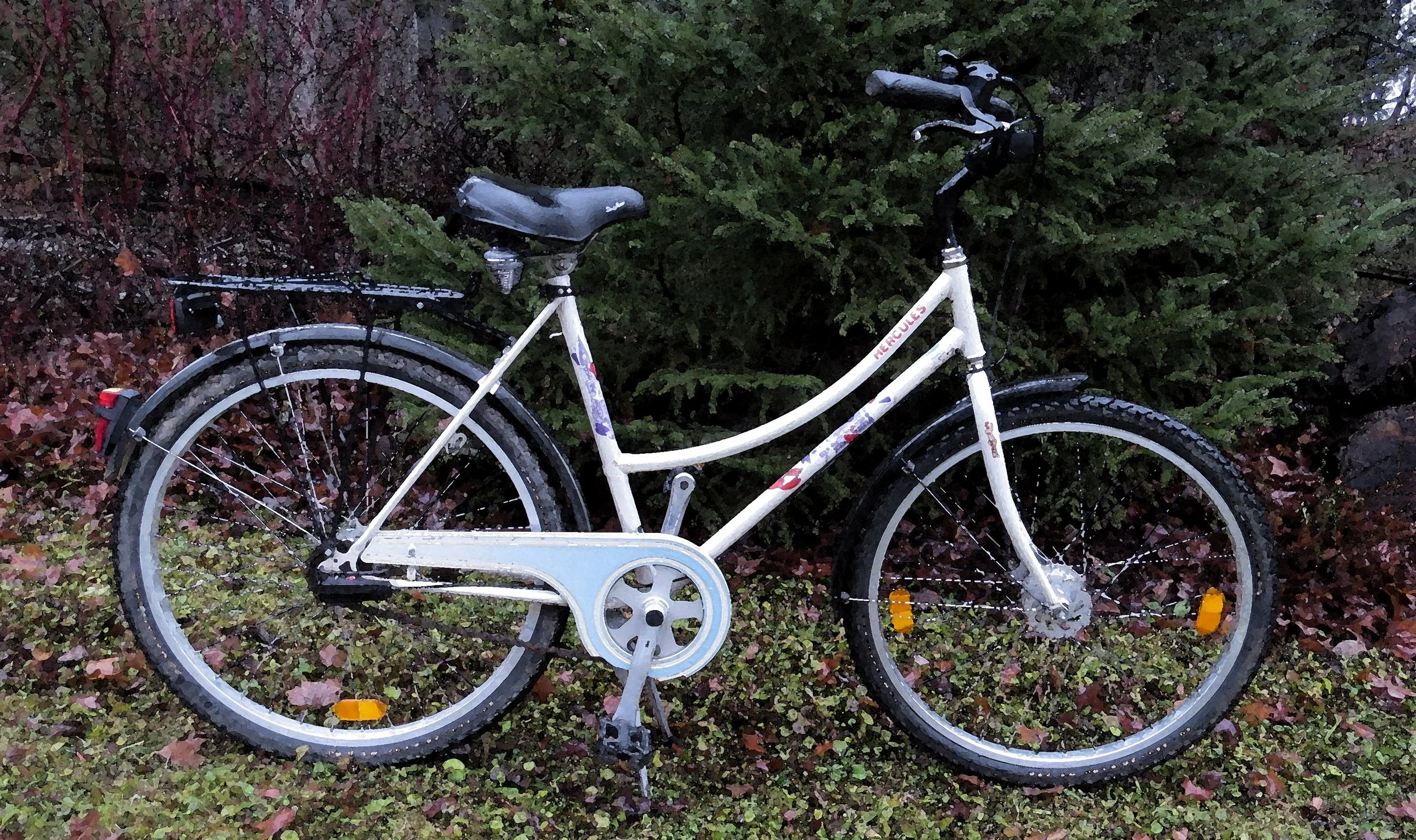 This summer I was given a bicycle. Second hand, but still a thing of beauty. When I was a kid, I had a boy-style mountain bike — crossbar, no fenders, and hence, very cool. Now, however, I appreciate such things as a ladies’ style open frame, fenders, and a wide, triangular, padded seat. All of these features my new bicycle possessed. Best of all, my new used bike had back-pedal brakes and limited gears for me to bungle while shifting.